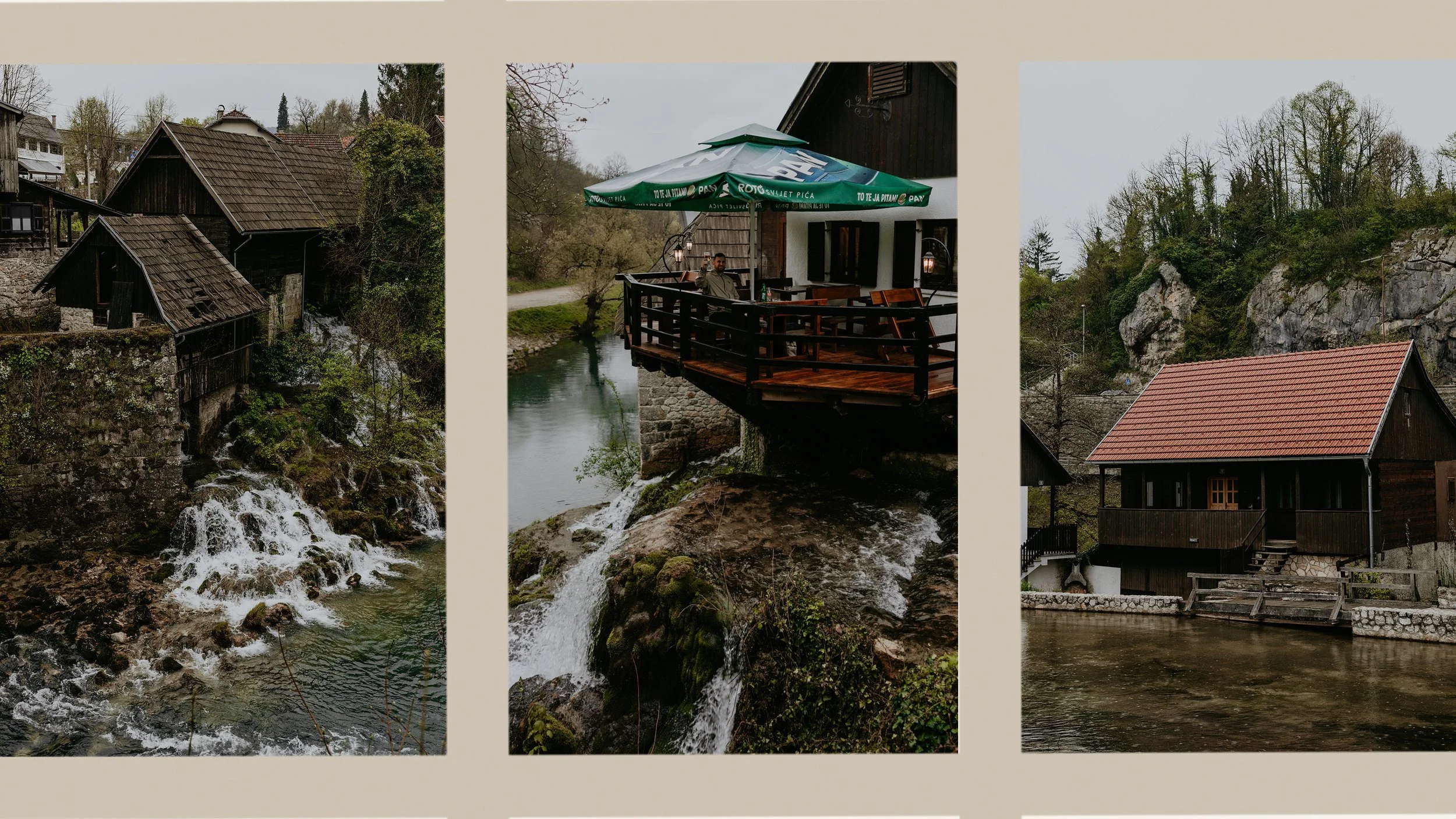 The town of Rastoke and the Vodena Ovca restaurant, perched atop the waterfall.